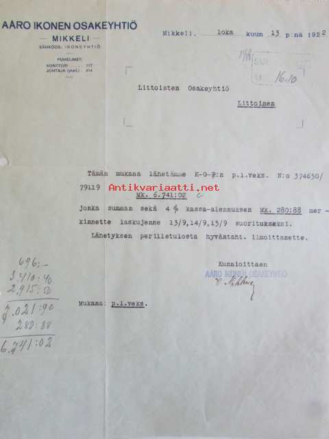 Aaro Ikonen Osakeyhtiö, Mikkeli lokakuun 6. 1922 - asiakirja