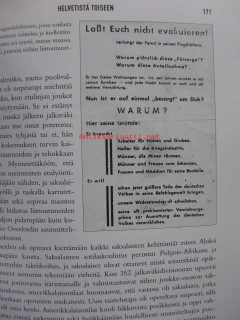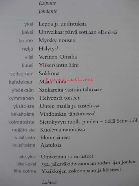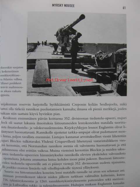 Taistelu Normandiasta - Maihinnousu saksalaisten silminNormandian maihinnoususta on kirjoitettu lukuisia teoksia, mutta yleensä liittoutuneiden näkökulmasta. Tämä kirja avaa uuden näkökulman sotahistorian suurimpaan maihinnousuun. Amerikkalaiset kärsivät verisesti Omaha Beachilla maihinnousualusten ramppien laskeutuessa ja sotilaiden astuessa rantaveteen. Heidän komentajansa olettivat vastassa olevan ainoastaan yhden miehityspataljoonan. Sen sijaan hyökkääjiä torjumassa oli 352. jalkaväkidivisioona. Alkoi kiivas taistelu ensin rannasta ja eloonjäämisestä, sen jälkeen etenemisestä syvemmälle Normandiaan. Saksalaiset taistelivat sitkeästi jokaisesta asemasta ja perääntyivät vain aloittaakseen vastahyökkäyksen kerran toisensa jälkeen. Taistelu Normandiasta oli eräs kaikkein aikojen peräänantamattomimmista taisteluista.Kenraaliluutnantti Dietrich Kraiss, 352. jalkaväkidivisioonan komentaja, oli monien alaistensa lailla karaistunut itärintaman veteraani. Kraiss ja hänen miehensä olivat tottuneet taistelemaan alakynnessä ja hallitsivat torjuntataistelun taidon. Liittoutuneiden maihinnousun kukistamiseen tarvittavia reservejä ei kuitenkaan koskaan saapunut vahvistukseksi, koska Saksan armeijan ylijohto kieltäytyi tunnustamasta sitä tosiasiaa, että Normandia oli maihinnousun päänäyttämö.Taistelu Normandiasta on merkittävä lisä toisesta maailmansodasta kertovaan kirjallisuuteen. Se kertoo siitä, kuinka vain yksi saksalainen divisioona vaikutti maihinnousun menestymiseen ja melkein koko sotaan lännessä.201 kuvaa