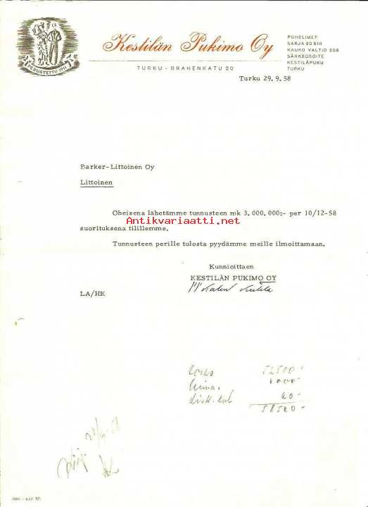 Kestilän Pukimo Oy, Turku 17.2.1958 - firmalomake