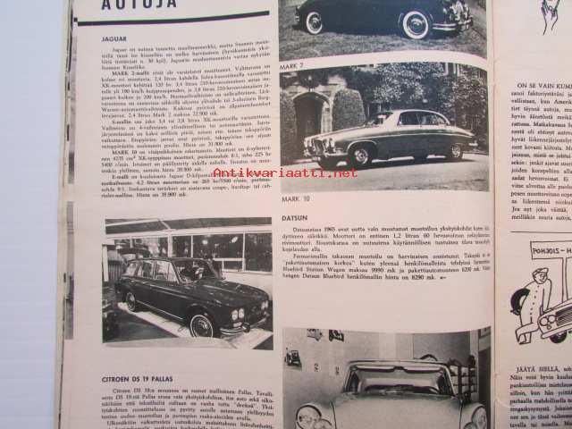 Tuulilasi 1965 nr 1 -mm. Kannessa Isuzu Bellet 1500, Tuulilasin testissä Trabant 601, Veneentekijä, Helmikuun autoja Citroen DS 19 Pallas, Jaquar Mark 2 ja Mark 10, Simca coupe 1000 ja 1500 Break, Fiat 1500, Moskvitsh 408, katso kuvista tarkempi sisältö.21 x 29 cm.