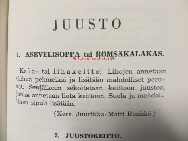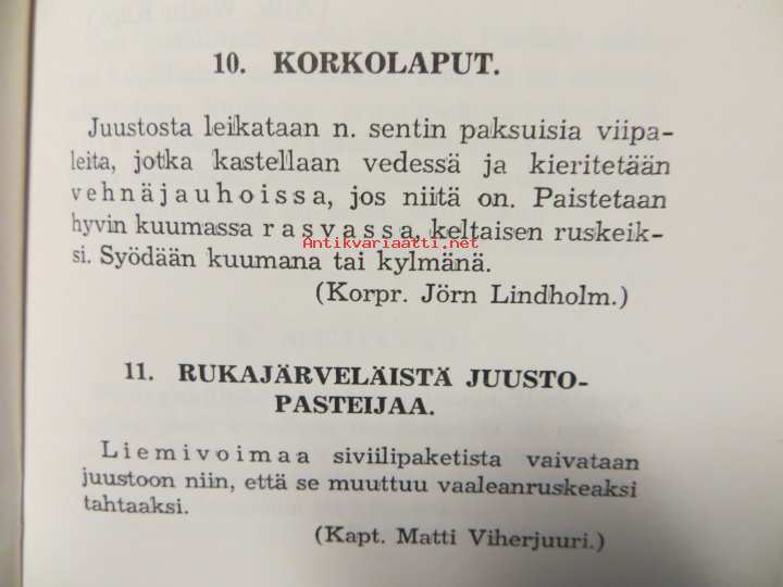 Ohjeiden antajina Suomen Sotilaan keittokikkakilpailun osanottajat. Pöperöillä hauskoja nimiä mm. Roiston rasva, halkomiesten pikakalja, hihnasta olalle, lotina, kylmälaukaus, huuppa, jankki, partiopottu, römpsäkalakas, savimiina, römpsäfisua ym.