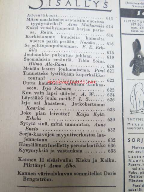 Kotiliesi 1945 nr 23, sis. mm. seur. artikkelit / kuvat / mainokset; Kansikuva sommitellut Doris Bengström, Mänttä paperinenäliinoja, Miten saataisiin maalaisolot nuorisoa tyydyttäviksi?, Kunta on yhteinen kotimme, Kaksi vuosikymmentä karjan parissa - tarkastuskarjakon taipaleelta - Maiju Viitala - Ilmajoki - Kurkistamme nuoren parin pesään, Se polttopuupulmamme, Joulunukke pukeutuu juhlaan, Suomalaisia emäntiä - Tilda Soini - Jämijärvi - Soinin tila, Uutta kauneutta vanhaan kankaaseen, Kuperkeikkatonttu teko-ohjeet, Kun vain lapsi säilyisi - lasten tuberkuloosi, Löytääkö joulu meille?, Joko pian leivotte?, Oy Vehnä Ab Raisio - siilot, Poimintapäivän tuoreita marjoja ja vihanneksia - Paulig syväjäädytystuotteet, Suomalaisia kirjokoruja - suunnitellut G. Paaer - Kalevala Koru Oy, ATO-koru, Kieku ja Kaiku, Euran Paperi joululiinat, ym.21 x 29 cm.