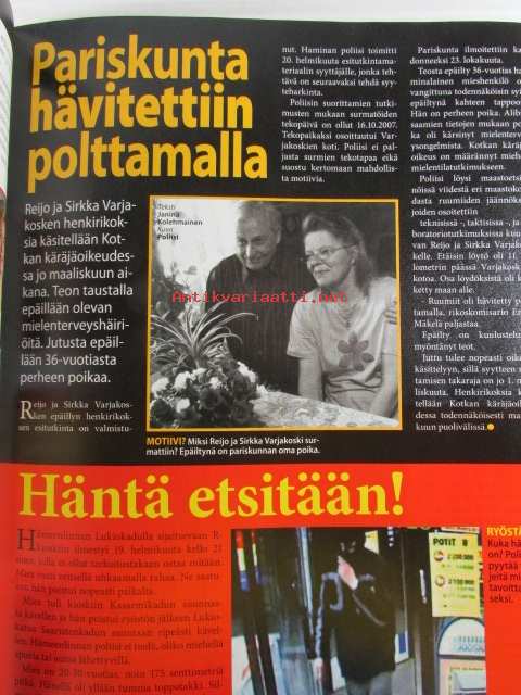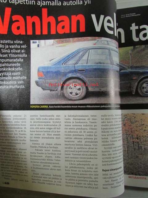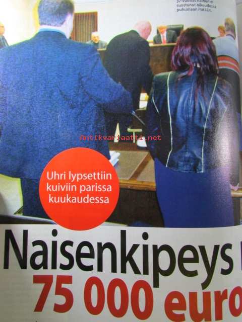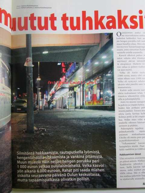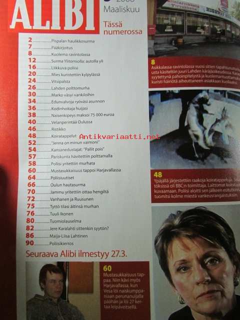 Alibi 2008 nr 3 -mm. Jalkajousimurhaaja halveksi naisia, 16-vuotias tytär tilasi äitinsä murhan, Ypäjän koiratappelut, Naisenkipeys maksoi 7500 euroa, Kodinhoitaja huijasi, Poltti elävältä kuoliaaksi viinapullon takia, Mies kuristettiin kypylähotelliEdenissä, Karaokeisäntä kuristi, katso kuvista sisältöä tarkemmin.22 x 28 cm.