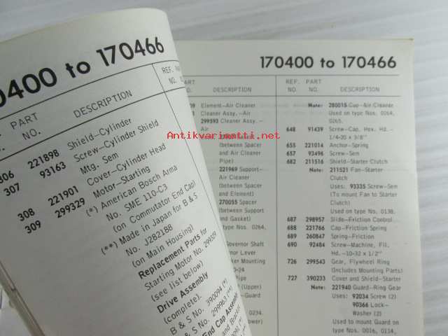 Briggs & Stratton Illustrated Parts List model series 170400 to 170466 Type numbers 0010 to 0076 / 0110 0271 - Varaosaluettelo