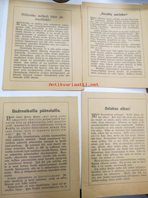 Sortawalan Ewankelisen Seuran herätyslehtiä. Tänään! ym. -28 kpl erilaisia valtaosin 4-sivuisia herätyslehtisiä, säilytyspussi ei liene alkuperäinen, painovuosi kaikissa 1920