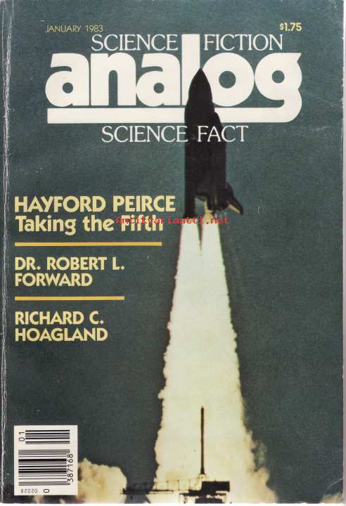 6 • Those Nasty Ol' Censors • [Editorial (Analog)] • essay by Stanley Schmidt14 • Taking the Fifth • novelette by Hayford Peirce49 • Biolog: Jay Kay Klein • [Biolog] • essay by Elizabeth Mitchell50 • The Blivit in the B-Ring (Part 2 of 2) • [Science Fact (Analog)] • essay by Richard C. Hoagland68 • The Vampires Who Loved Beowulf • shortstory by Mary Caraker84 • Department of Long-Range Planning • [The Alternate View] • essay by Jerry Pournelle88 • Cultural Exchange • shortstory by Bill Hays104 • On Gaming (Analog, January 1983) • [On Gaming] • essay by Dana Lombardy106 • Rocheworld (Part 2 of 3) • [Rocheworld • 1] • serial by Robert L. Forward (book publication as The Flight of the Dragonfly 1984)159 • The Reference Library (Analog, January 1983) • [The Reference Library] • essay by Thomas A. Easton [as by Tom Easton ]160 • Review of the musical album "Lumiere" by Cris Williamson • essay by Thomas A. Easton [as by Tom Easton ]165 • Brass Tacks (Analog, January 1983) • [Brass Tacks] • essay by uncredited169 • In Times to Come (Analog, January 1983) • [In Times to Come (Analog)] • essay by uncredited170 • Index (Analog, January 1983) • essay by uncredited178 • A Calendar of Upcoming Events (Analog, January 1983) • [Upcoming Events] • essay by Anthony R. Lewis [as by Anthony Lewis ]