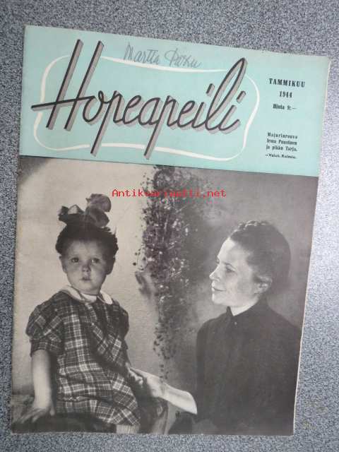 Hopeapeili 1944 nr 1 tammikuu, sis. mm. seur. artikkelit / kuvat / mainokset; Kansikuva majurinrouva Irma Puustinen ja pikku Tarja - miehensä on Mannerheimristin ritari Majuri Jukka Puustinen, Mitä teet tänä iltana virkanainen?, Zita Szeleczky - Budapestin lemmikki, Työn tuoksinassakin oikein pukeutuneena, Kotirintaman auttava käsi ei saa herpaantua, ym.22 x 29 cm.