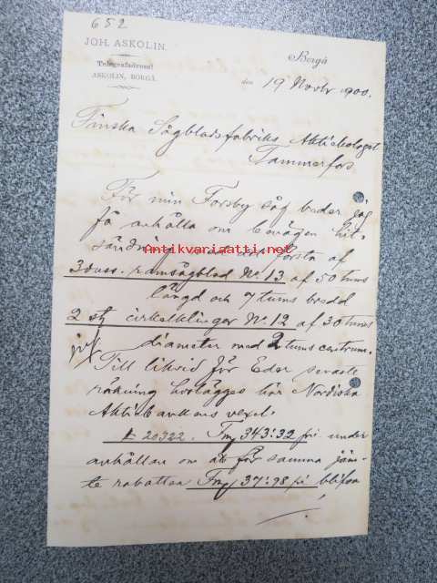 Joh. Askolin, Borgå & Forsby, 4.1.1936 - Suomen Sahanterätehdas Oy, Tampere -asiakirja -business document