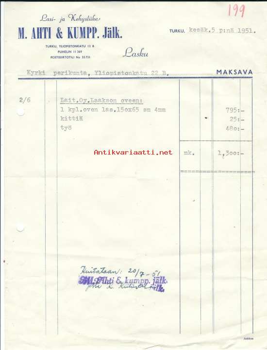 M.Ahti & Kumpp. Jälk Lasi- ja Kehysliike Turku 1951 - firmalomake