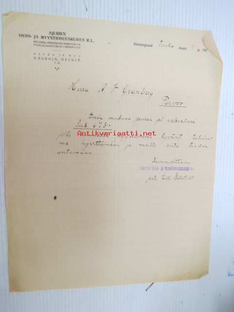 Ajurien osto- ja myyntiosuuskunta R.L., Helsinki 11.5.1923 -asiakirja