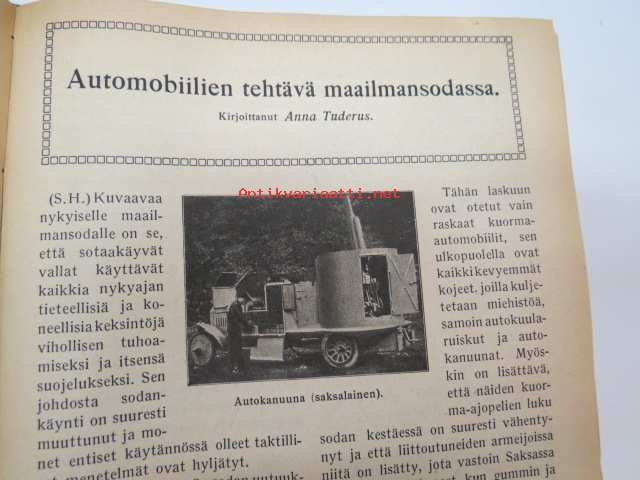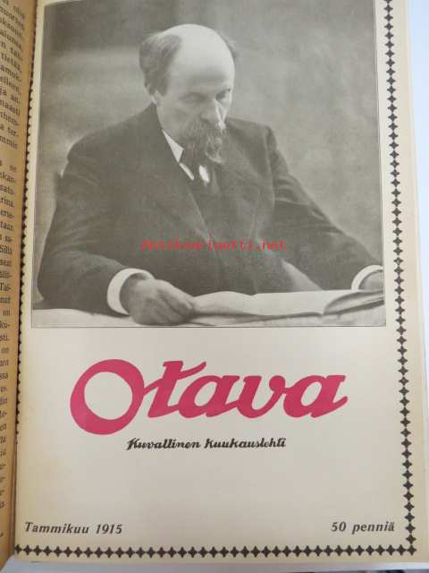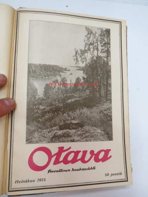 Otava - Kuvallinen kuukauslehti 1915 -sidottu vuosikerta, sisältää runsaasti mielenkiintoisia artikkeleita eri aihepiireistä, painokuvia, kannet sidottu tässä kappaleessa loppuun, sisällysluettelo näkyy kuvissa, mm. Kartanolta kartanolle -sarjaa Kankainen, Automobiilien tehtävä maailmansodassa, Kiiskilän hovi , Ala-Urpalan hovi, Louhisaari, Otto I. Meurman - Munkkiniemi ja Haaga, Muistelmia Minna Canthista, Suomalainen reki, Richard Faltin 80-vuotias, Perttulan tylsämielisten kasvatuslaitos "suomalaiset mongolit" = Downin syndrooma, Voimistelu parannuskeinona, Väinö Hämäläinen, Karhunpeijaisista, Rauma matkustajatulvan aikana, Panaman kanavan turvallisuus, Venehautaus Aurajoen suulla yli 1000 vuotta sitten, Lepaan puutarhaopisto, Sodankylän vanha kirkko, Pedri Shemeikka, Helsingin Kuuromykkäin Yhdistys, Ajattelevia hevosia, Kuvia Iin haminasta, ym.