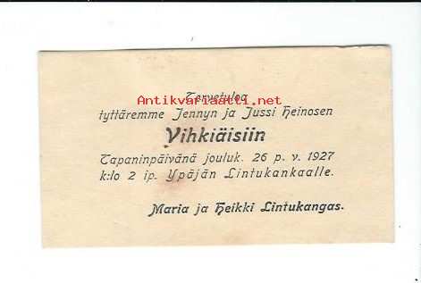 Tervetuloa Jenny ja Jussi Heinosen vihkijäisiin Ypäjän Lintukankaalle 1927 - vihkijäiskutsu