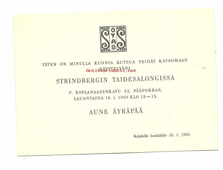 Aune Äyräpää näyttely Strinbergin Taidesalonki 1959 /Aune Äyräpää (9. tammikuuta 1898 Helsinki – 8. heinäkuuta 1981[1]) oli suomalainen taidemaalari.Hän sai päästötodistuksen Taideyhdistyksen piirustuskoulusta vuonna 1916, ja opiskeli sen jälkeen kaksi vuotta Taideteollisuuskorkeakoulussa. Myöhemmin hän opiskeli Ranskan taidekouluissa, mm. Pariisin maalausakatemiassa. Hän oli myös tekstiilitaiteilija ja suunnitteli ryijyjä.Äyräpään vanhemmat olivat Matti Äyräpää ja hänen puolisonsa Hilda os. Ingman