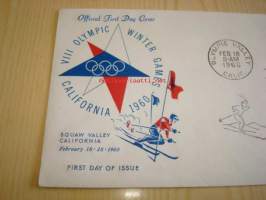 Squaw Valley talviolympialaiset, 1960, USA ensipäiväkuori FDC. Minulla on noin 1200 erilaista amerikkalaista ensipäiväkuorta 1920-luvulta 2000-luvulle, kysy jos haet jotakin tiettyä. Postitus Suomeen hyvin pakattuna muovikotelossa. Yhdellä postikululla tulee useampikin kuori samassa lähetyksessä. Voi maksaa Paypal tai mun pankin tilille Suomeen. Luotettavaa kaupankäyntiä jo neljällä vuosikymmenellä sekä Suomessa että Ruotsissä ympäri maailmaa. Minulla oli pitkän aikaa antiikkiliike Tampereella ennen Ruotsiin muuttoani.