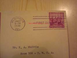 New Sweden Colony in Delaware 300th Anniversary 1638-1938 USA ensipäiväkuori FDC Ruotsin ja Suomen siirtokunnan matka Pohjois-Amerikkaan, minulla on myös vuoden