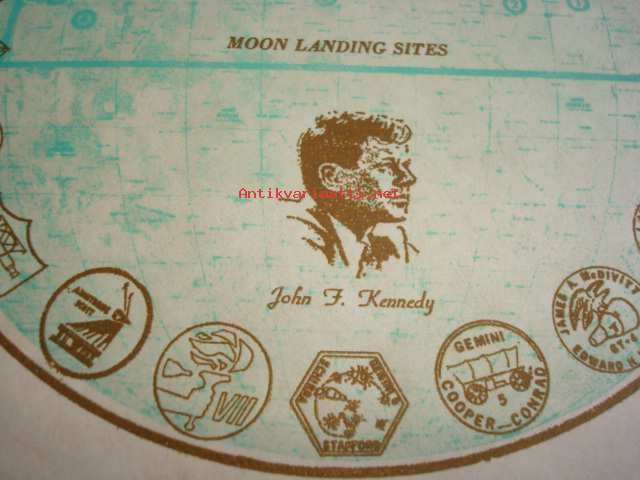 Moon Landing Sites kuuhun laskeutumiskohtien kartta 1969 USA ensipäiväleimalla ja Apollo 8 postimerkillä, John F. Kennedyn kuva, paperi on kuin pergamenttipaperia ja koko noin 22 cm x 22 cm. Hieno ja harvinainen.