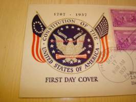Constitution, 1937, USA, ensipäiväkuori, FDC. Minulla on noin 1200 erilaista amerikkalaista ensipäiväkuorta 1920-luvulta 2000-luvulle, paljon eri aiheita, kysy jos haet jotakin tiettyä. Postitus Suomeen hyvin pakattuna muovikotelossa. Yhdellä postikululla tulee useampikin kuori samassa lähetyksessä. Voi maksaa Paypal tai mun pankin tilille Suomeen.Luotettavaa kaupankäyntiä jo neljällä vuosikymmenellä Suomessa ja Ruotsissa ympäri maailmaa. Minulla oli antiikkiliike Tampereella 18,5 vuotta ennen Ruotsiin muuttoani. Olen myös ollut myymässä useilla sadoilla antiikki- ja keräilymessuilla ympäri Suomea.