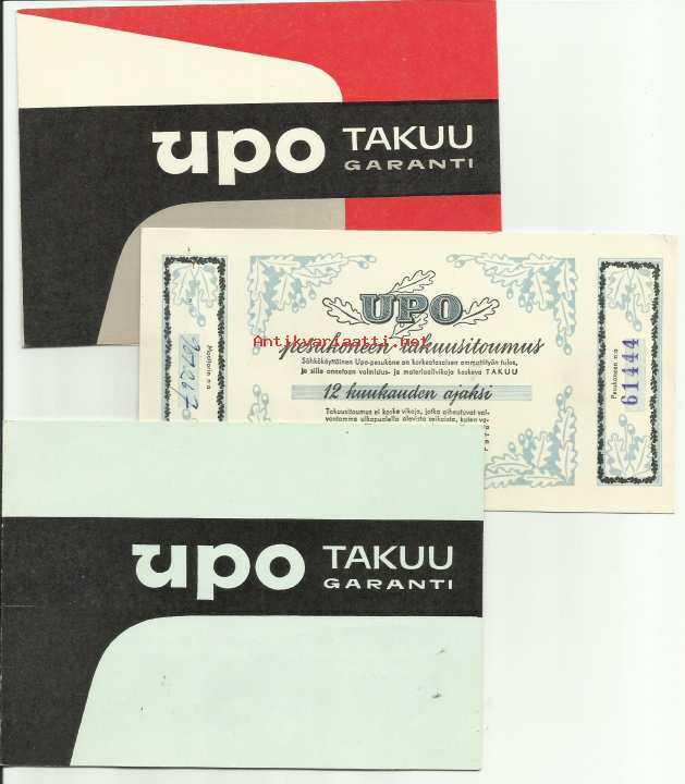 UPO pesukoneen, lingon ja sähkölieden takuutodistukset 3 kpl 1956-61 - takuutodistus
