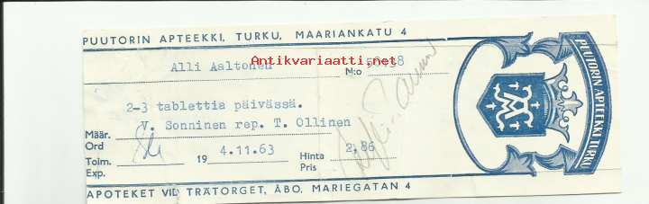 Puutorin apteekki, Turku, 11.12.1964 -apteekkisignatuuri