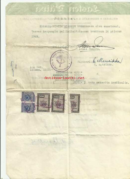 Lasten Päivä lupahakemus Vaasa 1949 - firmalomake veromerkein