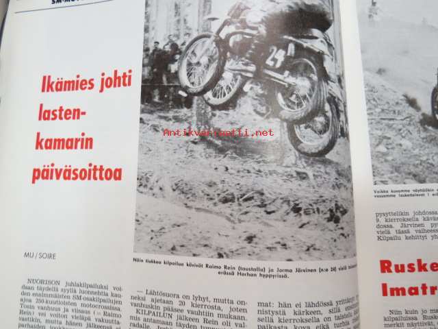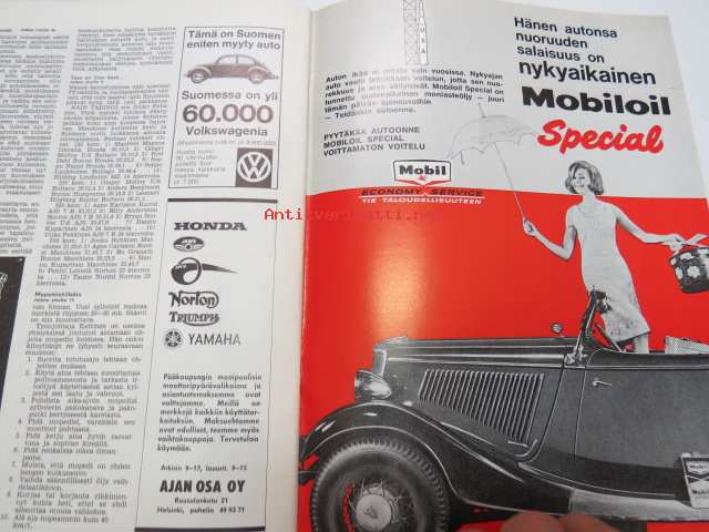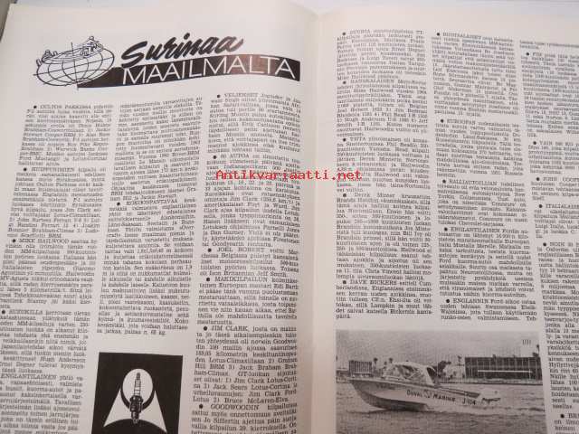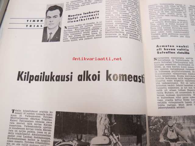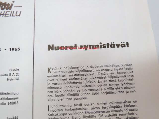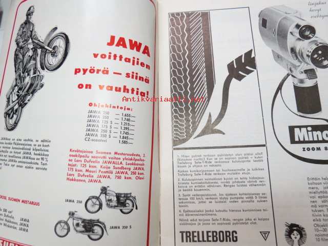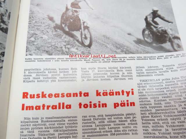 Moottoriurheilu 1965 nr 5, sis. mm. seuraavat artikkelit / kuvat, mainokset; Kansikuva Simca 1000, Jawa, Ruskeasanta, Neuvostoliiton kolmikko hallitsi Ruissalon ajoa, Näin on hoidettava moottoripyörää, Ducati 250 Monoalbero, Reima Lohkovuori, Turku Artukainen Sadan Auton ajot, Rusty Steele -sarjakuva, Puch Tunturi SR 150 scootteri, Mobiloil, Saab, ym. -motoring magazine21 x 30 cm.