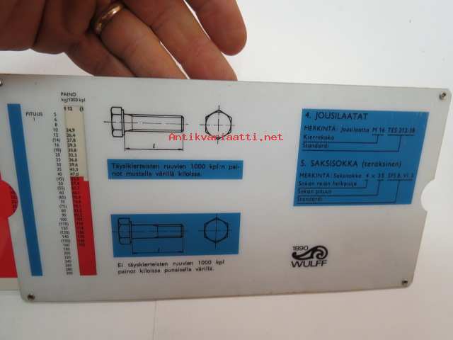 Wulff - 1. Kuusioruuvit, 2. Kuusiomutterit, 3. Aluslaatat, 4. Jousilaatat, 5. Saksisokka -nousut, avainvälit, karkeudet, 100 kpl painot kiloissa ym. tekniset tiedot -laskutikku / vetotaulukko / muunnosviivain -diagram11 x 22 cm.