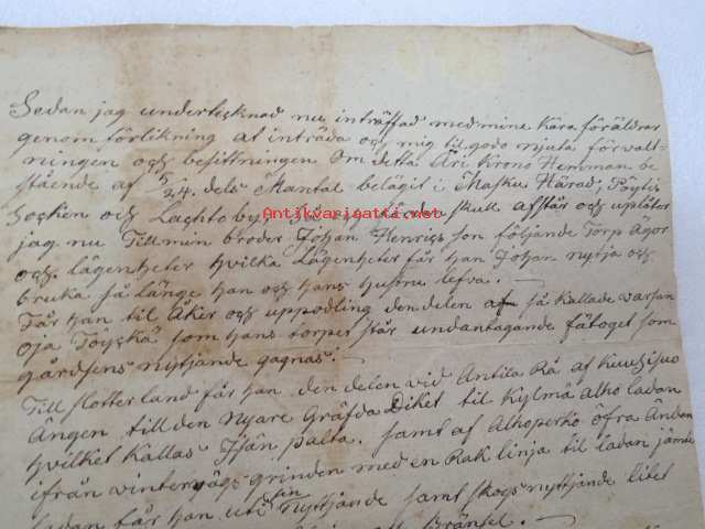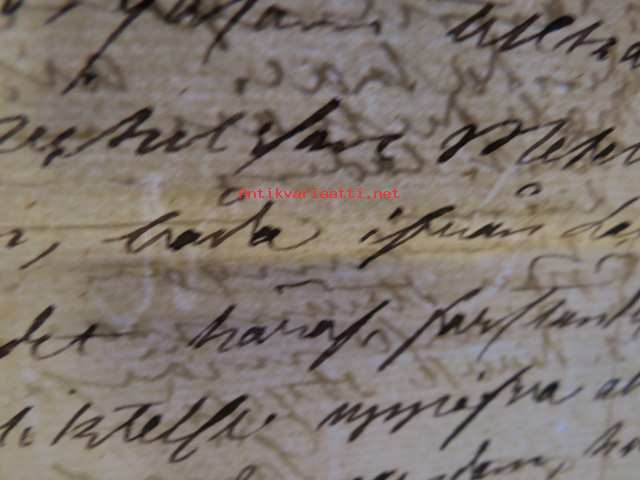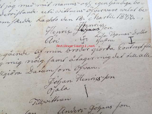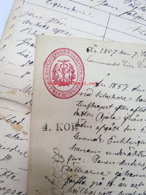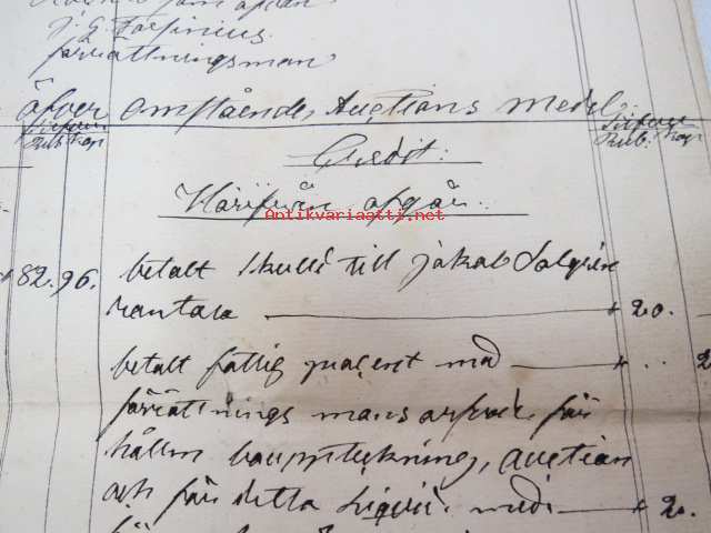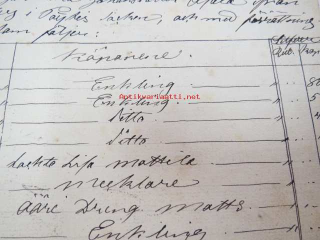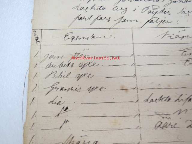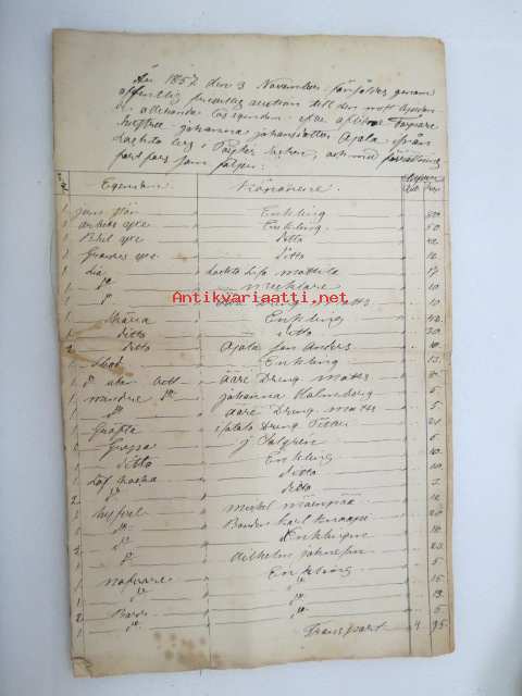 "År 1857 den 2. juni förrattats af undertecknad klockare bouppteckning och wärdering öfwer qvarlåtenskapet efter aflidne torpare hustru Johanna Johansdotter Ojala ifrån Lachto by af Pöytis socken (Lahto, Pöytyä), som med döden afgått den 5. mars nuvarande år... / ...försåldes genom offentlig frivillig auction 3.11.1857 ... allehanda lös egendom..." -ruotsinkieliset alkuperäiset asiakirjat - Johanna Juhanintytär Ojalan seikkaperäinen perukirja ja huutokauppaluettelo pesän omaisuudesta -vesileimattu arkki, 1 kpl 4 kopeekan arkkeja - koho- ja musteleimaus (TERTILÄ nr 5), sekä 2 arkkia yhtenä asiakirjana GRANFORS IA lumppupaperia -original documents 2 pcs stating the value and stand of estate after death of Johanna Ojala and auction document