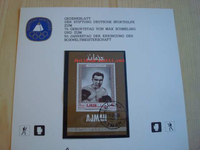 Nyrkkeilijä Max Schmeling Souvenir Sheet postimerkkiarkki 1969 & hänen nimikirjoituksensa. Minulla on noin 1200 erilaista amerikkalaista ensipäiväkuorta 1920-luvulta 2000-luvulle, paljon eri aiheita, kysy jos haet jotakin tiettyä. Postitus Suomeen hyvin pakattuna muovikotelossa. Postituskulut lisätään tuotteiden hintoihin, ei toimitusmaksua tai muita ylimääräisiä kuluja postimaksun päälle. Joten odota kun olen lähettänyt sähköpostiviestin tilausvahvistuksen jälkeen, jossa kerron postimaksun. Tilausvahvistuksessa oleva toimitusmaksu (0,00 euroa) ei ole postituskulut. Yhdellä postimaksulla tulee useampikin postimerkki/kuori/maksikortti samassa lähetyksessä. Voi maksaa Paypal tai mun pankin tilille Suomeen.Luotettavaa kaupankäyntiä jo neljällä vuosikymmenellä Suomessa ja Ruotsissa ympäri maailmaa. Minulla oli antiikkiliike Suomessa 18,5 vuotta ennen Ruotsiin muuttoani.Olen ollut myymässä sadoilla antiikki- ja keräilymessuilla ympäri Suomea.