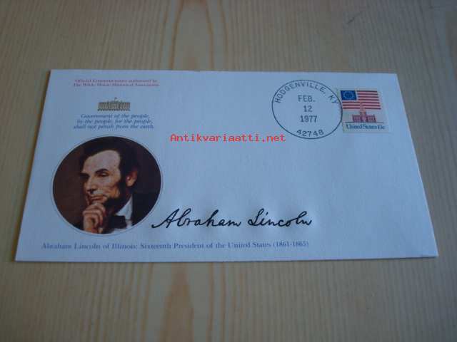 Presidentti Abraham Lincoln, 1977, USA, ensipäiväkuori, FDC, hieno esim. lahjaksi. Katso myös muut kohteeni mm. noin 1 500 erilaista amerikkalaista ensipäiväkuorta, noin 1 000 erilaista ulkomaista maksikorttia ym. Lähes jokapäivä lisään uusia kohteita myyntiin kauppaani. Teen myös erilaisia filateliatauluja, satoja eri aihevaihtoehtoja, ota yhteyttä jos olet kiinnostunut jostakin tietystä aiheesta.