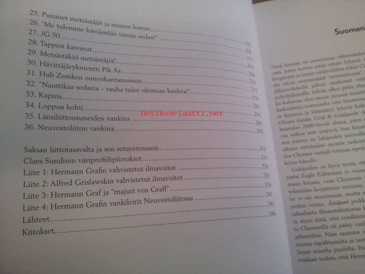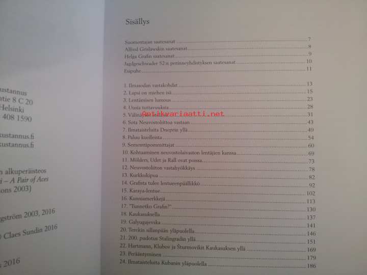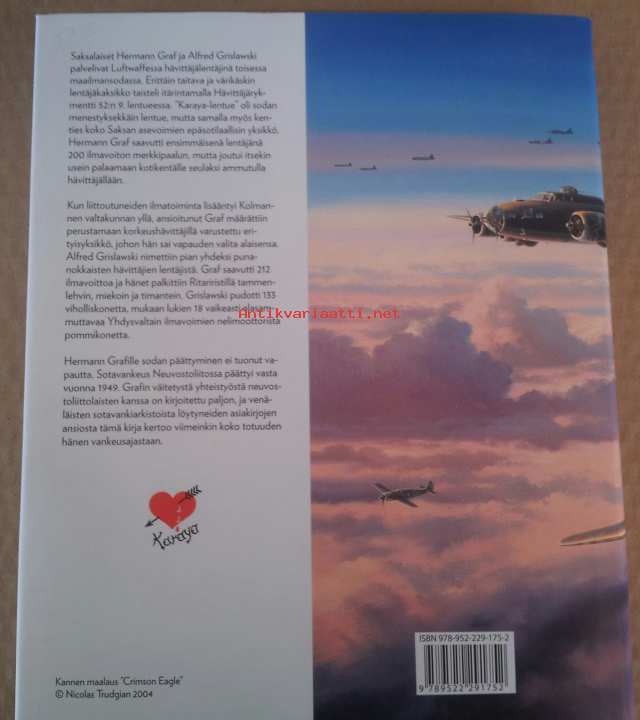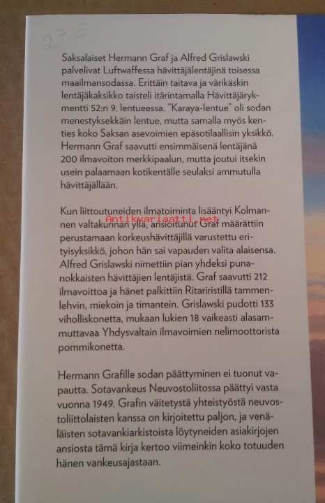 Christer BergströmÄssäpari - Hermann Graf & Alfred GrislawskiSaksalaiset Hermann Graf ja Alfred Grislawski palvelivat Luftwaffessa hävittäjälentäjinä toisessa maailmansodassa. Erittäin taitava ja värikäskin lentäjäkaksikko taisteli itärintamalla Hävittäjärykmentti 52:n 9. lentueessa. ”Karaya-lentue” oli sodan menestyksekkäin lentue, mutta samalla myös kenties koko Saksan asevoimien epäsotilaallisin yksikkö. Hermann Graf saavutti ensimmäisenä lentäjänä 200 ilmavoiton merkkipaalun, mutta joutui itsekin usein palaamaan kotikentälle seulaksi ammutulla hävittäjällään.Kun liittoutuneiden ilmatoiminta lisääntyi Kolmannen valtakunnan yllä, ansioitunut Graf määrättiin perustamaan korkeushävittäjillä varustettu erityisyksikkö, johon hän sai vapauden valita alaisensa. Alfred Grislawski nimettiin pian yhdeksi punanokkaisten hävittäjien lentäjistä. Graf saavutti 212 ilmavoittoa ja hänet palkittiin Ritariristillä tammenlehvin, miekoin ja timantein. Grislawski pudotti 133 viholliskonetta, mukaan lukien 18 vaikeasti alasammuttavaa Yhdysvaltain ilmavoimien nelimoottorista pommikonetta.Hermann Grafille sodan päättyminen ei tuonut vapautta. Sotavankeus Neuvostoliitossa päättyi vasta vuonna 1949. Grafin väitetystä yhteistyöstä neuvostoliittolaisten kanssa on kirjoitettu paljon, ja venäläisten sotavankiarkistoista löytyneiden asiakirjojen ansiosta tämä kirja kertoo viimeinkin koko totuuden hänen vankeusajastaan.Ruotsalainen ilmailuhistorioitsija Christer Bergström on kirjoittanut tämän teoksen yhteistyössä Alfred Grislawskin kanssa. Teoksessa katetaan ilmasodan tapahtumat sodan molempien osapuolten näkökulmasta. Claes Sundin on piirtänyt 20 ainutlaatuista väriprofiilipiirrosta Grafin ja Grislawskin lentämistä koneista. Kirjassa on myös 300 pääosin ennen julkaisematonta valokuvaa.