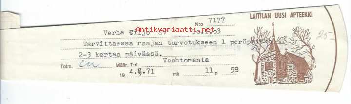 Laitilan Uusi Apteekki - resepti signatuuri 1971
