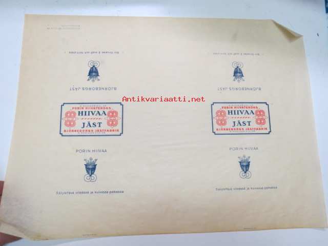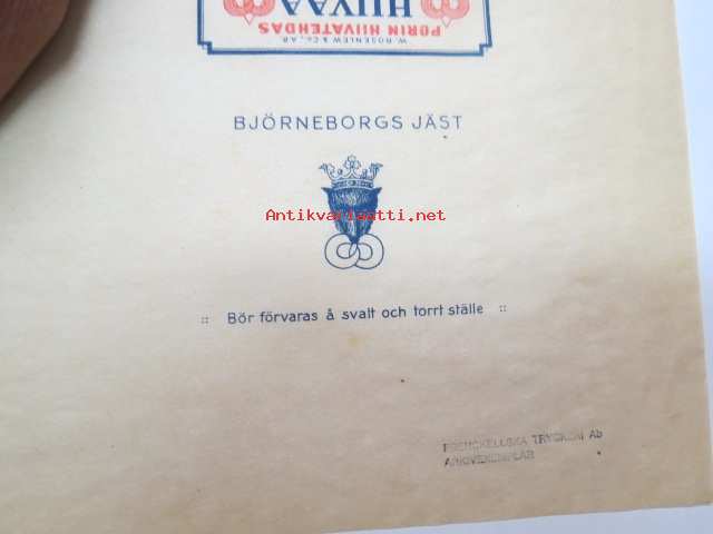 Porin hiivaa - Björneborgs jäst - W. Rosenlew & Co Ab -kirjapainon (Frenckell, leimattu) arkistokappale -yeast wrap