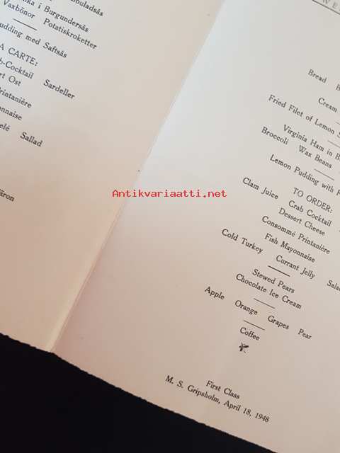 Swedish American Line, Luncheon, First Class, M. S. Gripsholm, April 10, 1948