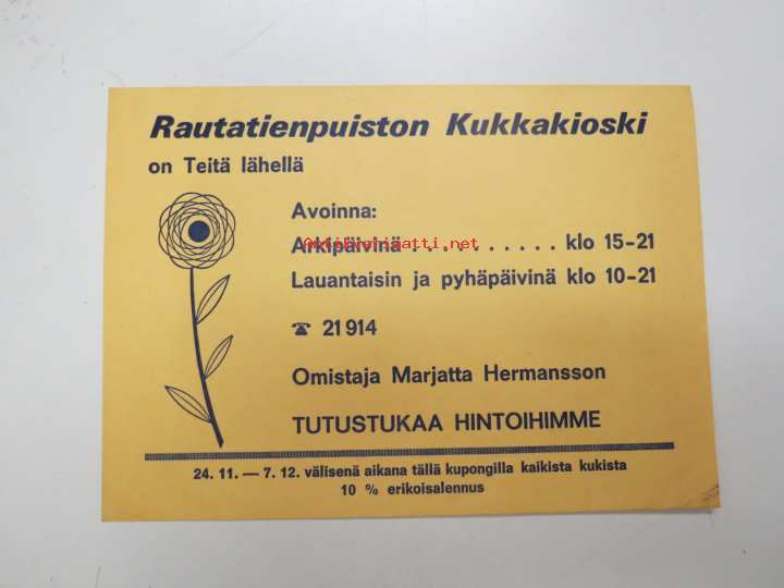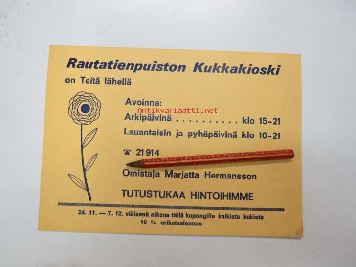 Rautatienpuiston Kukkakioski - omistaa Marjatta Hermansson -mainos / flower shop ad
