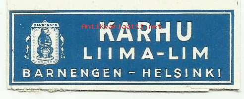 Karhu liimaa - tuote-etiketti 2x6 cm vuodelta 1928