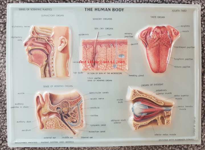 THE HUMAN BODY. Ihmisen aistinelimet: haju/nenä, tunto/iho, maku/kieli, kuulo/korva ja näkö/silmä. Taulu 4.