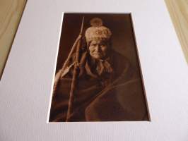 Intiaanipäällikkö Geronimo, valokuva ja nimikirjoitus joka on painettu paksuhkolle ja matalle valokuvapaperille. Paspiksen koko A4 eli helppo kehystää.