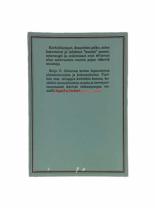 Keijo O. Grönroos kertoo lapsuutensa elämäntavoista ja kokemuksista 40-luvun alun sotavuosien Suomessa, jolloin siirappia keitettiin kotona, kerättiin muurahaisten munia, ja terveysviranomaiset kävivät täikampanjaa viemällä lapsilta hiukset.