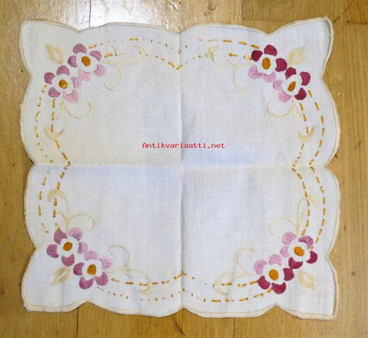 Liinakankaalle merkattu liina. Koko 72 x 72 cm. Nostalgista istuskelua liinan äärellä, kahvin, teen tai vaikka viinilasin kanssa