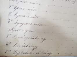 20 x 23 cm, käsinkirjoitettu ruotsinkielinen laskuopin oppikirja, kirjoittajana ollut lukkari (klockare) Carl Johan Ekenberg, Hämeenlinna. Kohteesta on 53 kuvaa - kertovat hyvin mistä on kysymys.
