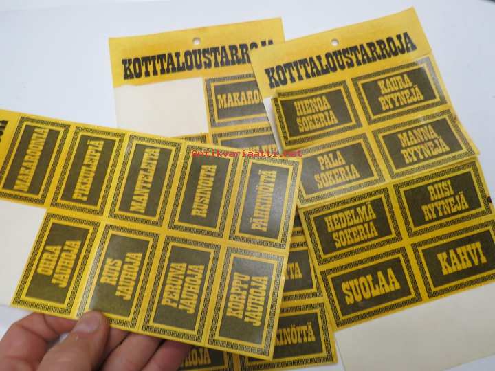 Kotitaloustarroja, 3 arkkia, osa käytetty, tarrapinta kuivunut, 1960-luvun lopulta