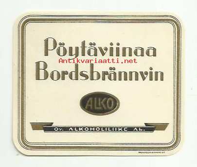 Alko Pöytäviinaa Bordsbrännvin -viinaetiketti 1930-luvulta