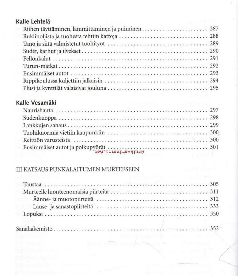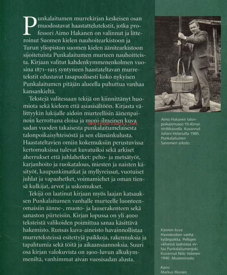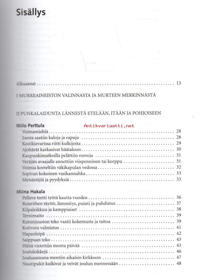 Kirjasta välittyy lukijalle aidoin murteellisin äänenpainoin sävyttynyt eloisa ja moni-ilmeinen kuva sadan vuoden takaisesta punkalaitumelaisesta agraariyhteiskunnasta. Valaistuksi tulevat pellon raivaus, muokkaus ja ojitus, heinä- ja elotyöt, rukiinleikkuu ja riihenpuinti, pellava- ja mallassaunat, metsätyöt ja rakentaminen, tervahaudat ja tiilimiilut, karjanhoito, hevosvaljaat ja ajoneuvot, puuastiat, tuohityöt, vihdanteko ja tallukkaat, kehruut ja kankaan kudonta, ruisleipä, naurishauta, kutunjuusto ja kalja, sudenkuoppa ja teerentöntö, kestikievarit ja kaupunkireissut, kansalaissodan melskeet, kamppiaiset, talkoot ja häät, joulu ja juhannus, nuutipukit, pääsiäisnoidat ja laskiaisen vietto, lasten leikit ja nuorten huvit, haltijat, kummitukset ja rosvot, voimamiehet ja oman tiensä kulkijat, arvot ja uskomukset. Kirjan rungon (n. 250 painosivua) muodostavat 1800-luvun loppuvuosikymmeninä syntyneiden punkalaitumelaisten haastatteluista litteroidut tekstit, jotka on valittu Suomen kielen nauhoitearkistoon ja Turun yliopiston suomen kielen äänitearkistoon sijoitetuista Punkalaitumen murteen nauhoitteista. Kirjaan valitut lähes 30 puhujan tekstit edustavat tasapuolisesti koko nykyisen Punkalaitumen pitäjän alueella puhuttua vanhaa kansanmurretta. Kirjaan sisältyy myös laaja katsaus (n. 35 sivua) Punkalaitumen vanhalle murteelle luonteenomaisiin äänne-, muoto- ja lauserakenteen sekä sanaston piirteisiin. Kirjan lopussa on yli 4 000 teksteistä valikoiden poimittua sanaa käsittävä hakemisto. Kirjan runsas kuva-aineisto havainnollistaa ja elävöittää murreteksteissä esitettyjä paikkoja, rakennelmia ja tapahtumia sekä työsuorituksia ja aikaansaannoksia