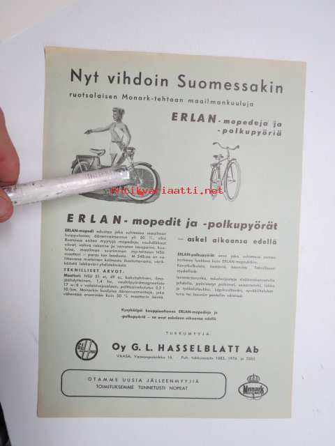 Monark Erlan mopedi ja polkupyörät (Oy G.L. Hasselblatt Ab, Vaasa) -myyntiesite (esite on arviolta 1950-luvun lopulta)