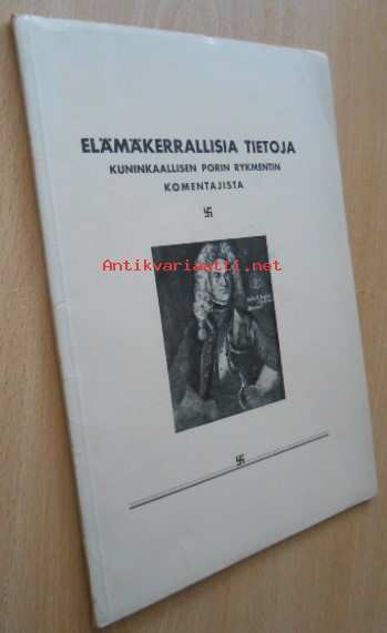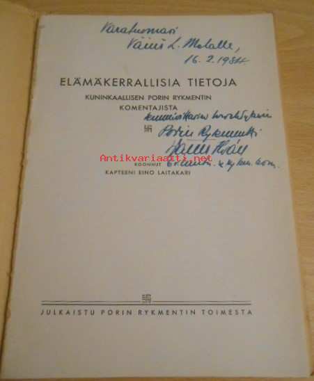 Kirjassa Porin rykmentin komentajan omistekirjoitus ? ja päiväys 16.2.1934Kannet sidoksesta irti, ollut liimasidos, muuten sivut ehjät, Postitus Helposti-kirje A4