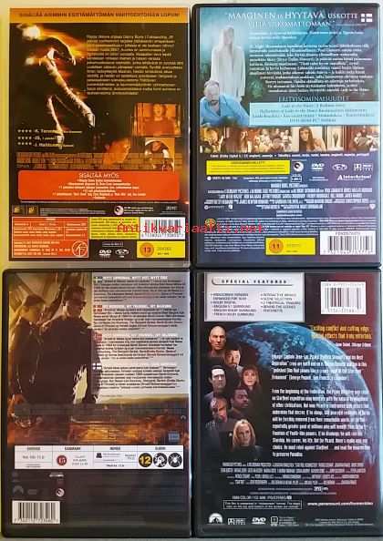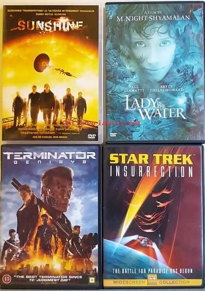 Setti 9 koostuu neljästä leffasta: Lady in the Water, Star Trek - Insurrection, Terminator Genisys, Sunshine. DVD-levyjen kunto on tarkastettu silmämääräisesti. Testattu siten, että avautuuko leffa DVD-soittimessa. Kaikissa leffoissa on ainakin suomenkielinen tekstitys. Reksut puuttuvat kotelon sisäpuolelta. Osta kaksi settiä tarjoushintaan 8,00 euroa.
