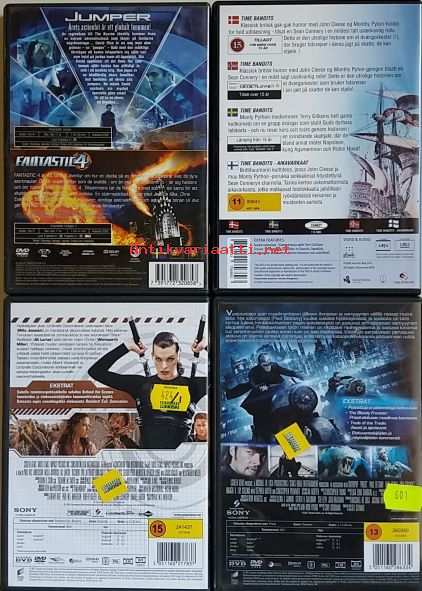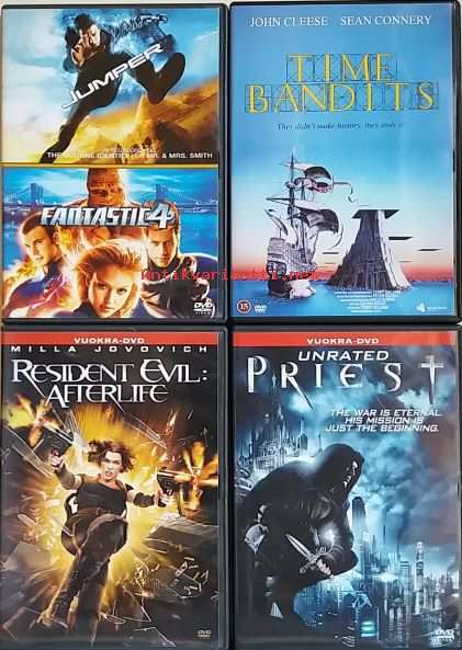 Setti 59 koostuu neljästä leffasta: Priest, Resident Evil - Afterlife, Jumper ja Fantastic 4,Time Bandits. Kaikissa leffoissa on ainakin suomenkielinen tekstitys. Reksut puuttuvat kotelon sisäpuolelta. Osta kaksi settiä tarjoushintaan 8,00 euroa.