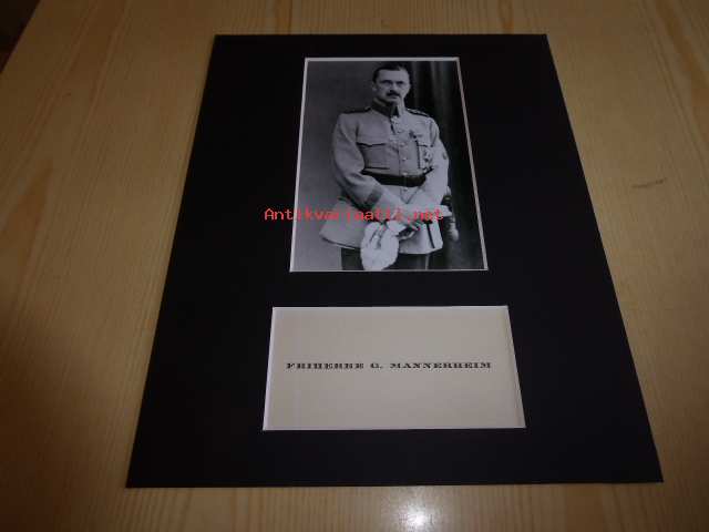 Mannerheim valokuva ja hänen käyntikortti, molemmat ovat uusintapainoksia. Paspiksen koko 20 cm x 25 cm eli helppo kehystää. Hieno esim. lahjaksi.Katso myös sivustoni: www.mannerheim-ristinritarit.comPostitus Suomeen hyvin pakattuna. Postituskulut lisätään tuotteiden hintohin. Voi maksaa mun pankin tilille Suomeen. Luotettavaa kaupankäyntiä jo viidellä vuosikymmenellä sekä Suomessa että Ruotsissä ympäri maailmaa. Minulla oli 18,5 vuotta antiikkiliike Tampereella ennen Ruotsiin muuttoani. Olen myös ollut myymässä sadoilla antiikki- ja keräilymessuilla ympäri Suomea.