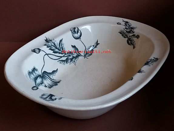 Korkeus 5 cm, leveys 20 cm, pituus 25 cm paino 615 gKoriste: Vallmo/kuparipainokoristeMateriaali: fajanssiMassaleima: 191/AA