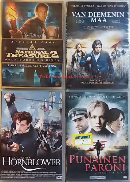 Setti 72 koostuu neljästä leffasta: Van Diemenin maa, Punainen Paroni, Hornblower, National Treasure 2. Testattu siten, että avautuuko leffa DVD-soittimessa. Kaikissa leffoissa on ainakin suomenkielinen tekstitys. Reksut puuttuvat kotelon sisäpuolelta. Osta kaksi settiä tarjoushintaan 8,00 euroa.